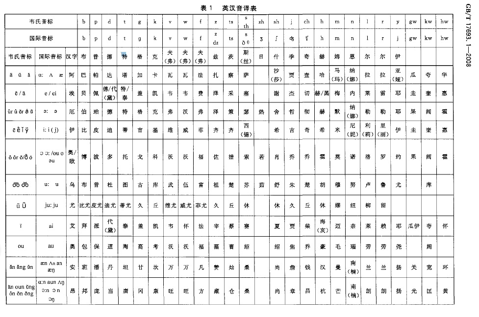 圖1 國標(biāo)《外語地名漢字譯寫導(dǎo)則英語》中的英漢音譯表(部分)